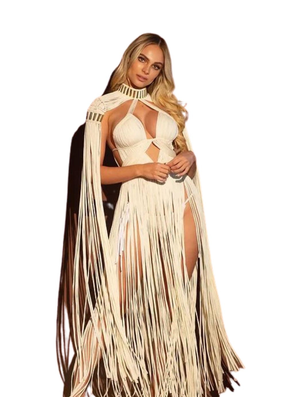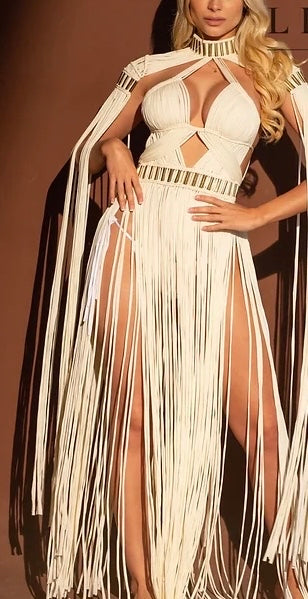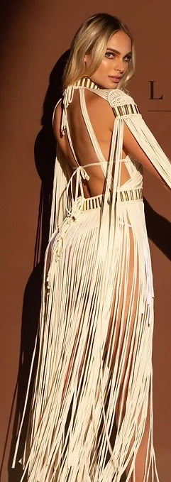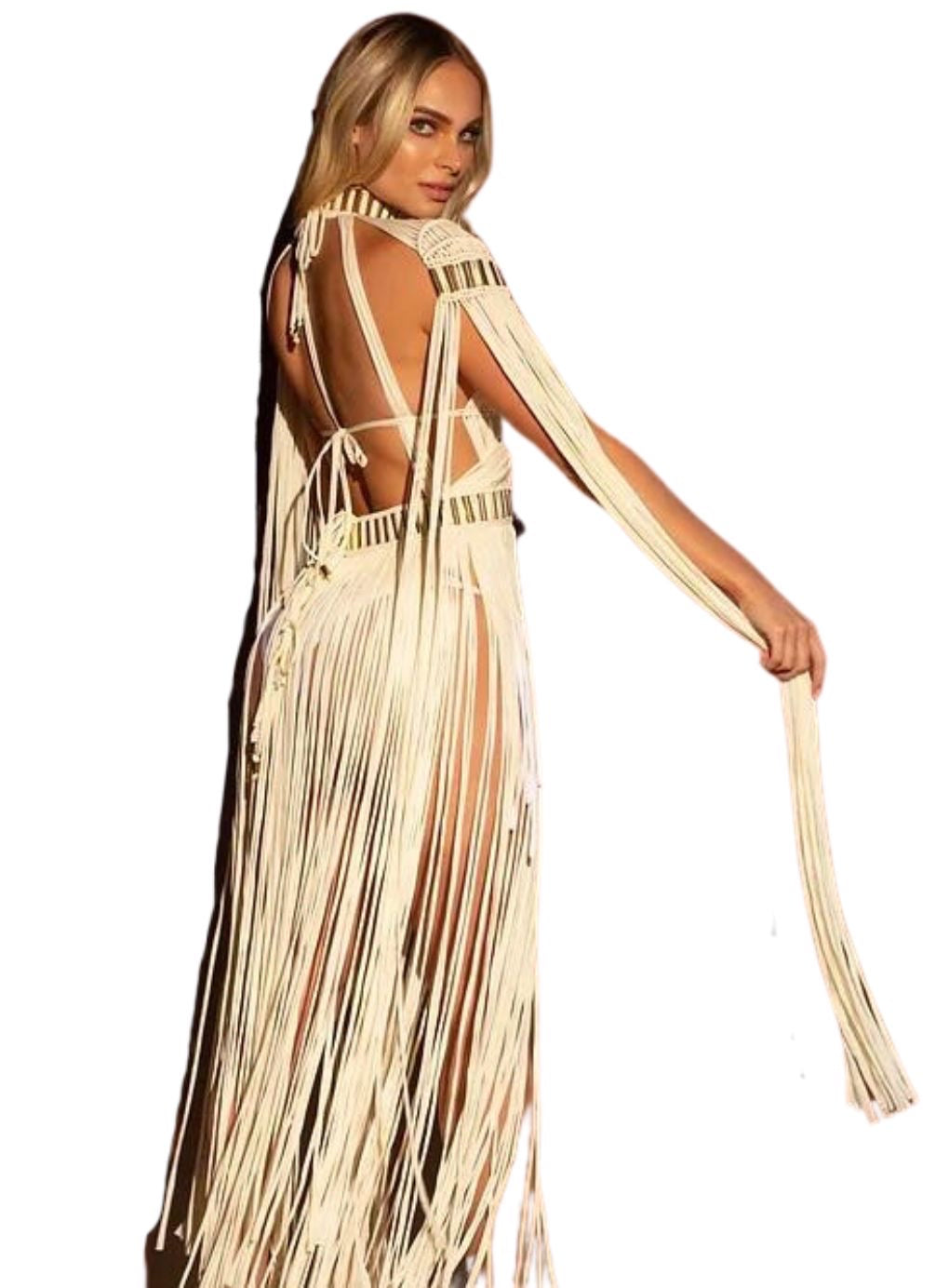 Our macrame dress represents an elegant and luxurious fusion of traditional hand-knotting art, perfect for the unique woman who seeks a touch of luxury with a bohemian flair.