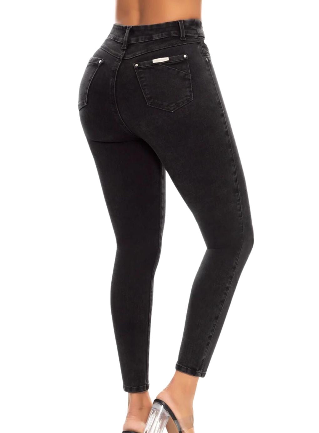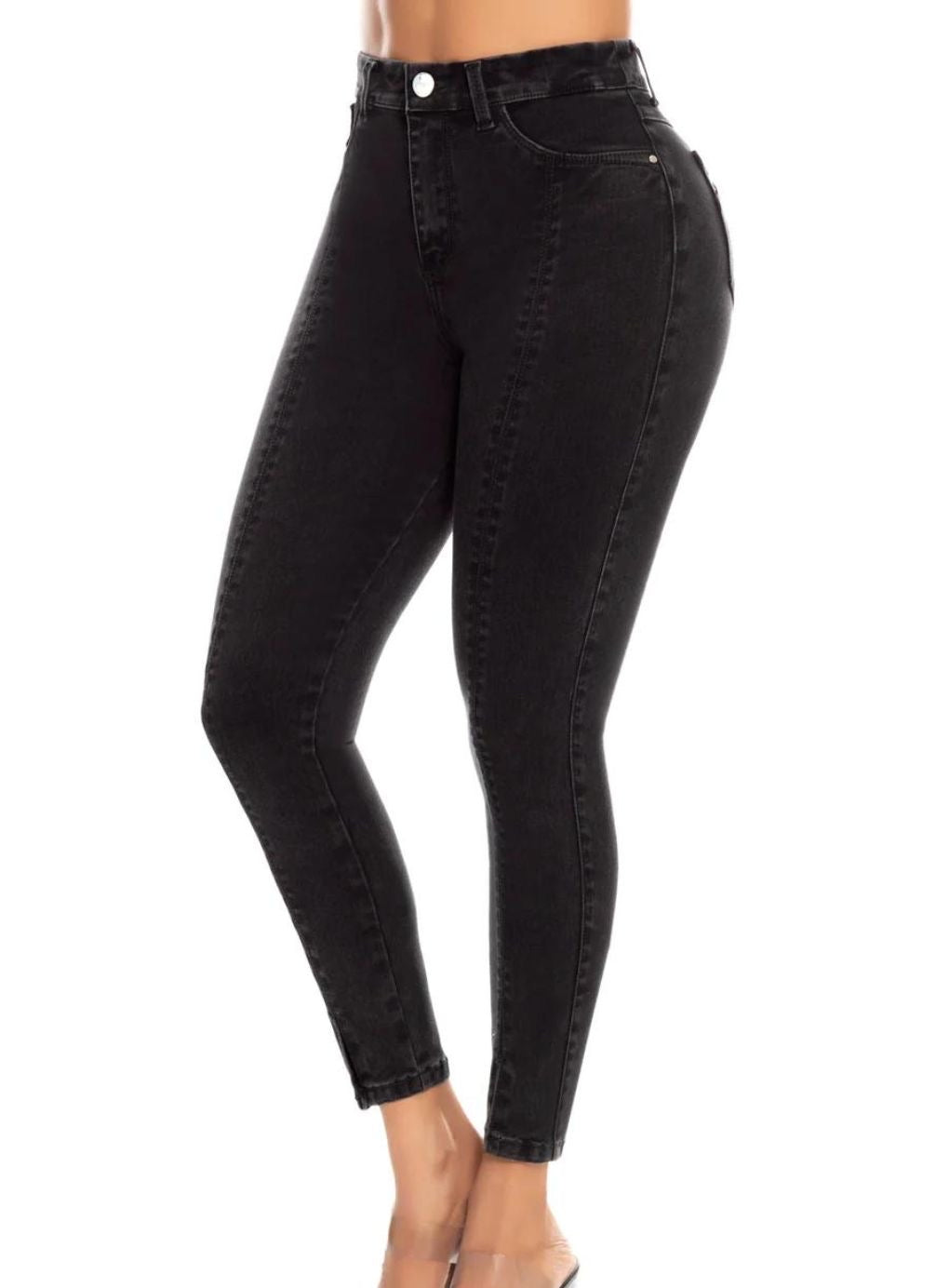 Colombian Jeans Butt Lift Blue. They are skinny boot pants, with a wide waistband with a high-rise button, in blue, made in indigo with contrasting contours with decorative appliqués, with back pockets. The hem design is rustic, it has the best comfort and last to highlight your figure.
