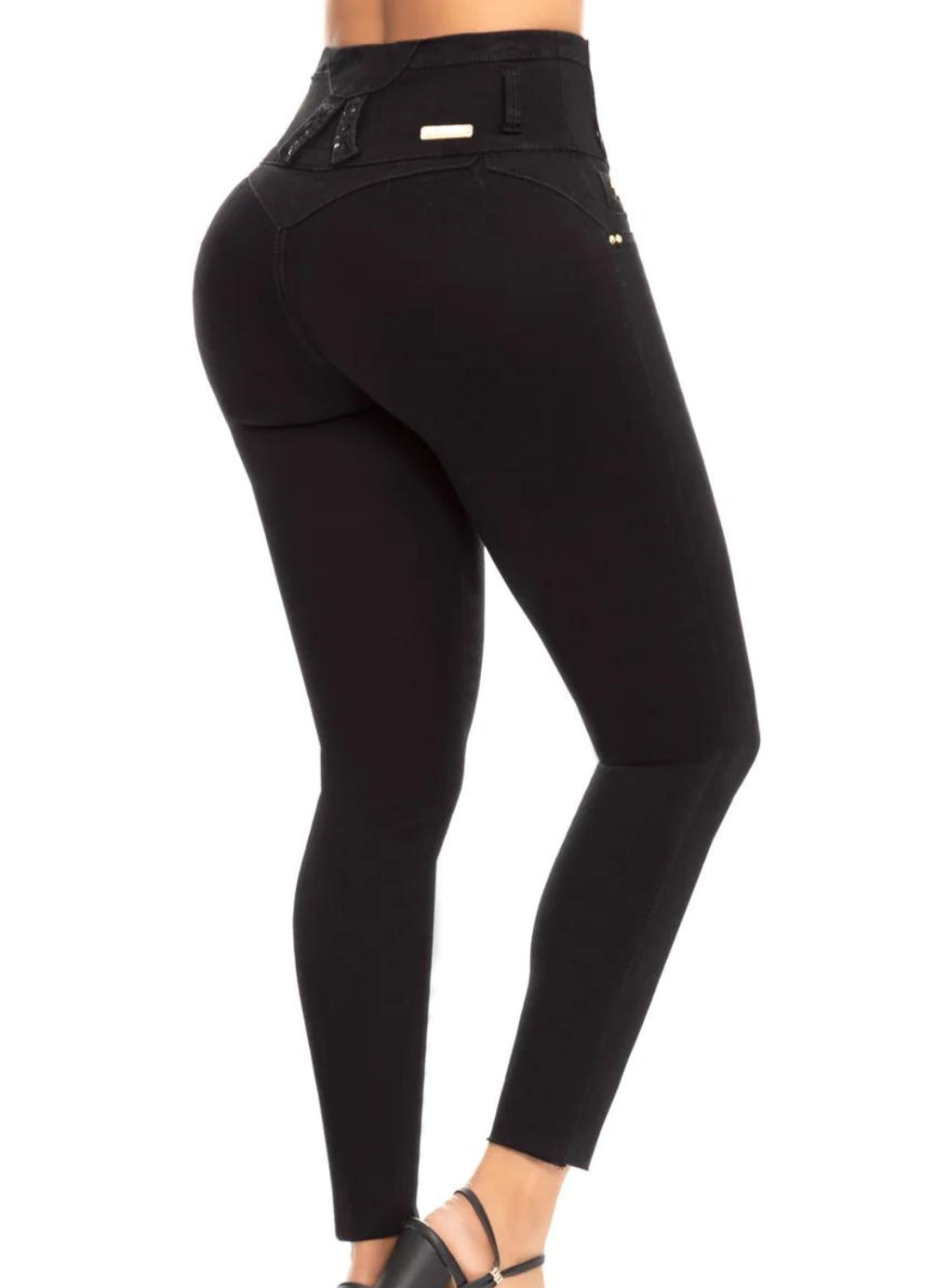 Colombian Denim Butt Lift Black. Skinny boot pants, with a wide waistband with five mid-rise buttons, in black, made in indigo with contrasting contours with decorative appliqués, without back pockets. The hem design is rustic, it has the best comfort and last to highlight your figure.