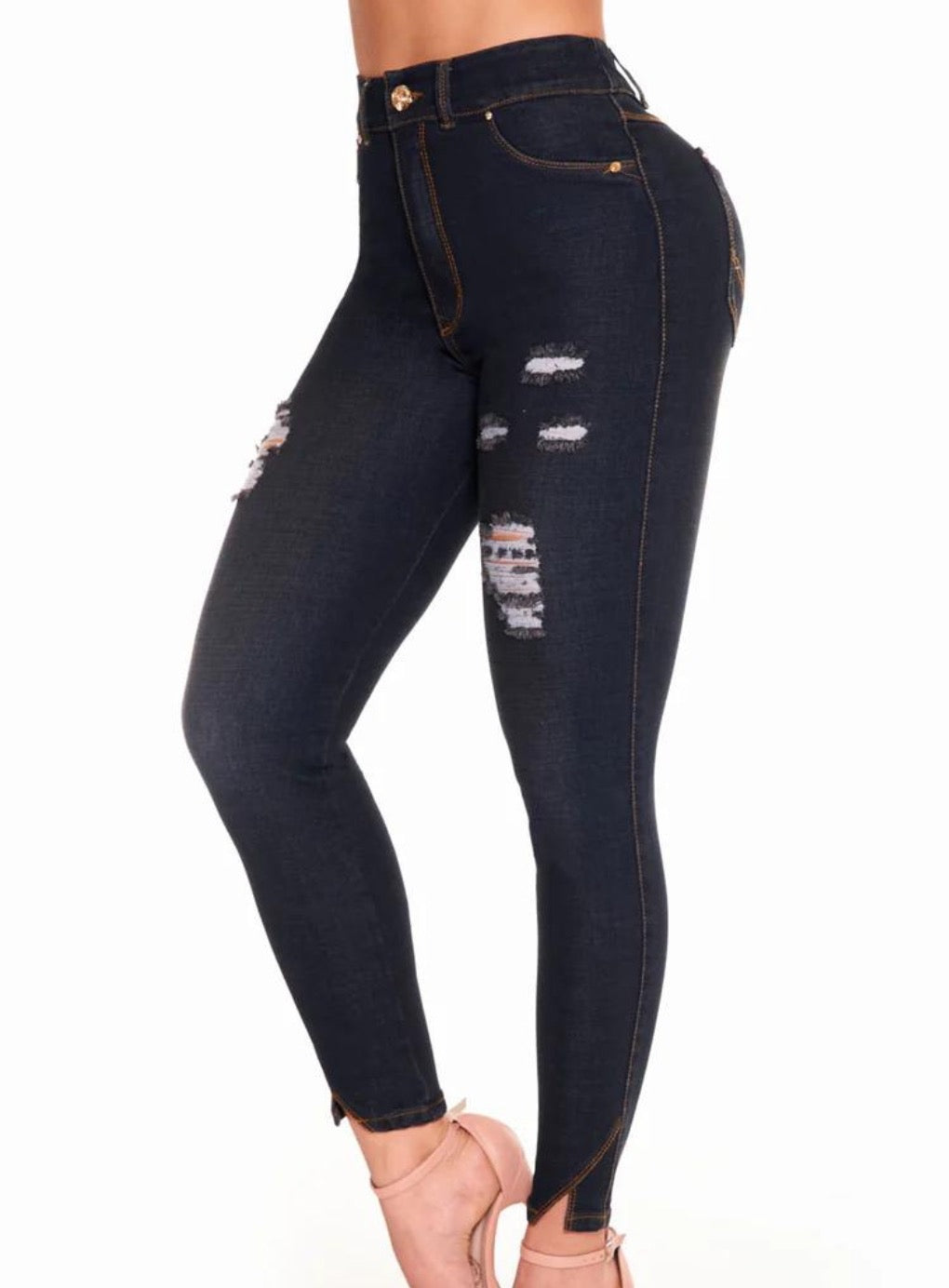Colombian Jeans Butt Lift Blue. They are skinny boot pants, with a wide waistband with a high-rise button, in blue, made in indigo with contrasting contours with decorative appliqués, with back pockets. The hem design is rustic, it has the best comfort and last to highlight your figure.