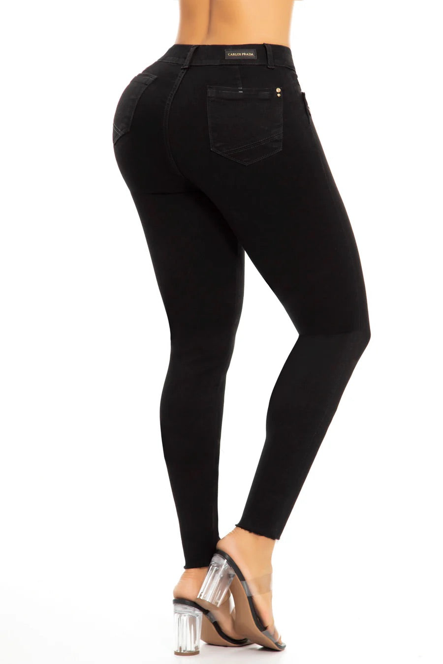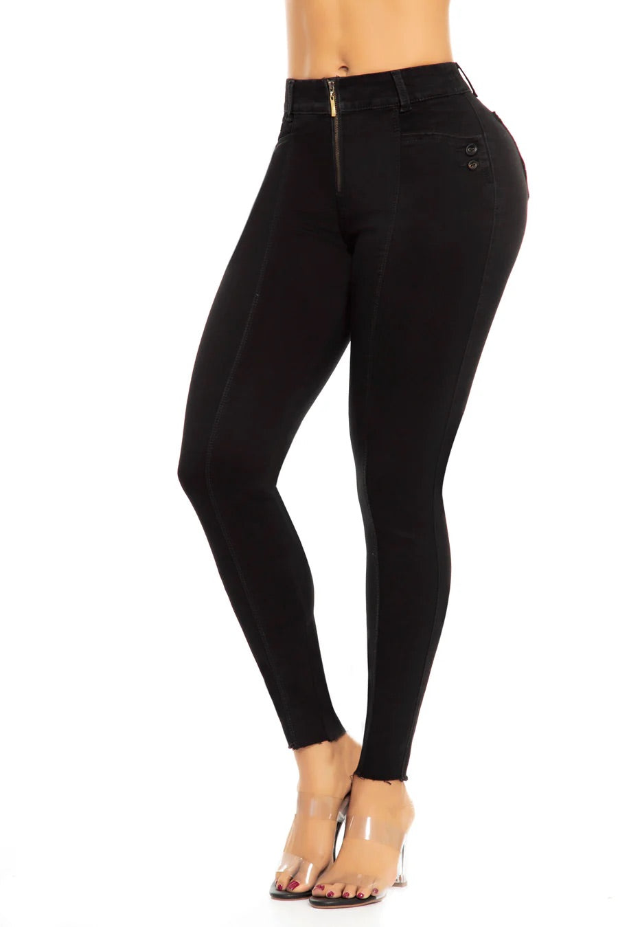 These are skinny bootcut pants with a thin waistband, front closure, mid-rise, in black made in indigo with contrasting contours with decorative appliqués, with back pockets. The hem design is rustic, it has the best comfort and shape to highlight your figure.