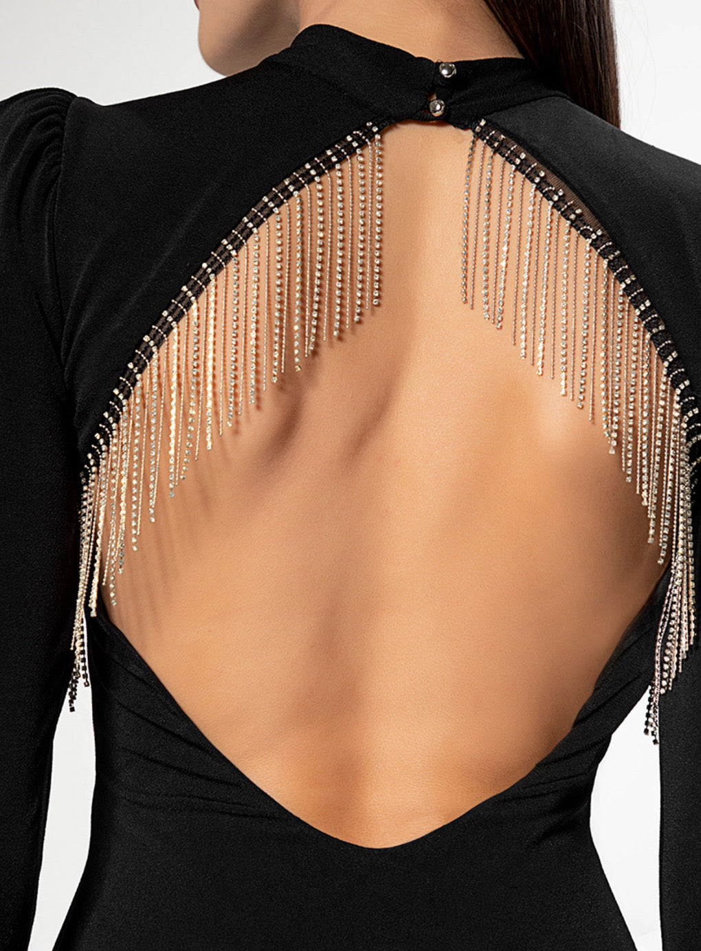 This glamorous piece features a stunning see-through back and a chic buttoned neck detail.