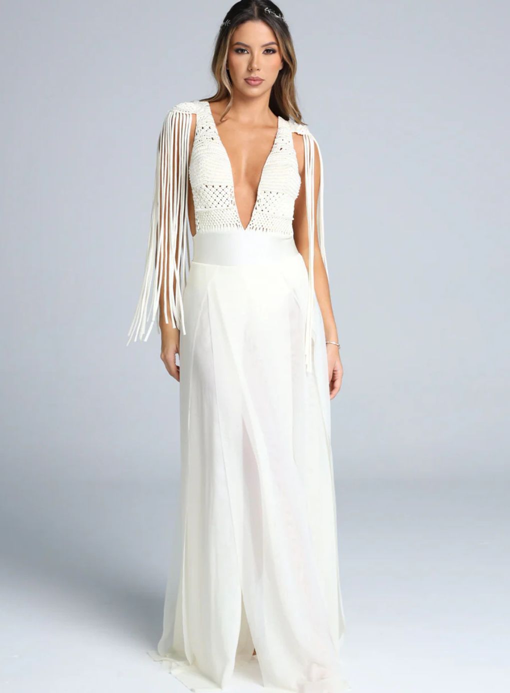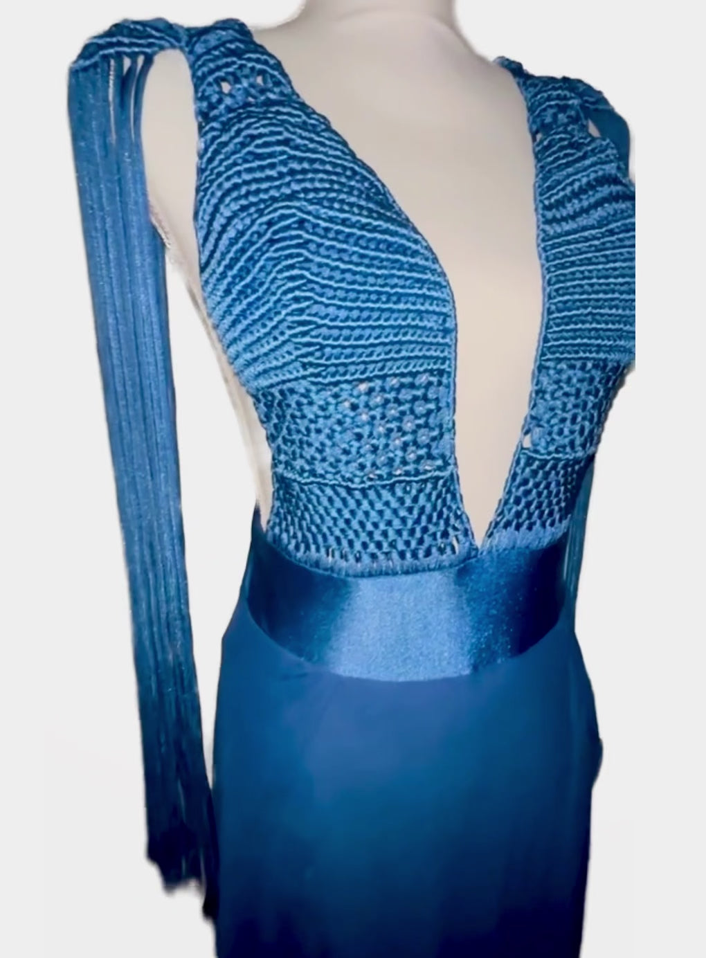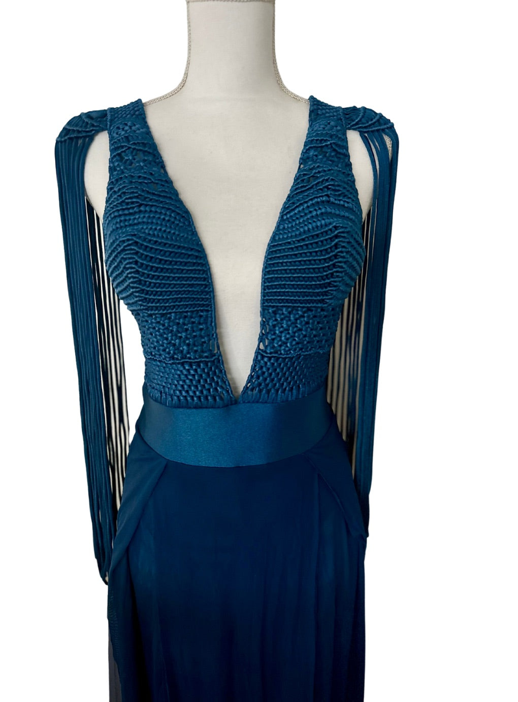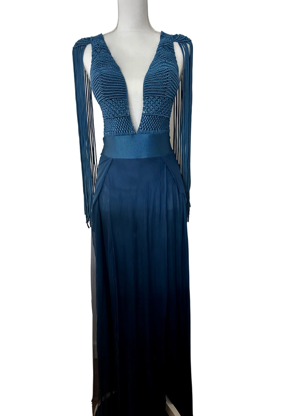 Turn heads with this show-stopping Dress—a one-of-a-kind gown designed to captivate. This stunning piece features a dramatic plunging neckline, a wide waistband, and a luxurious tulle skirt with multiple leg slits for added allure. The macramé woven bust and low-back design exude sophistication, while the shoulder pads and extended block fabric tulle skirt create a striking silhouette. The fringe detail on the shoulders adds a touch of drama, ensuring all eyes are on you at any event.