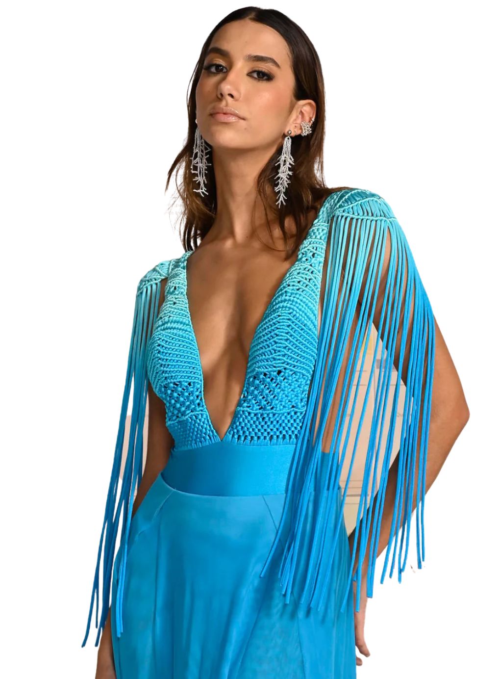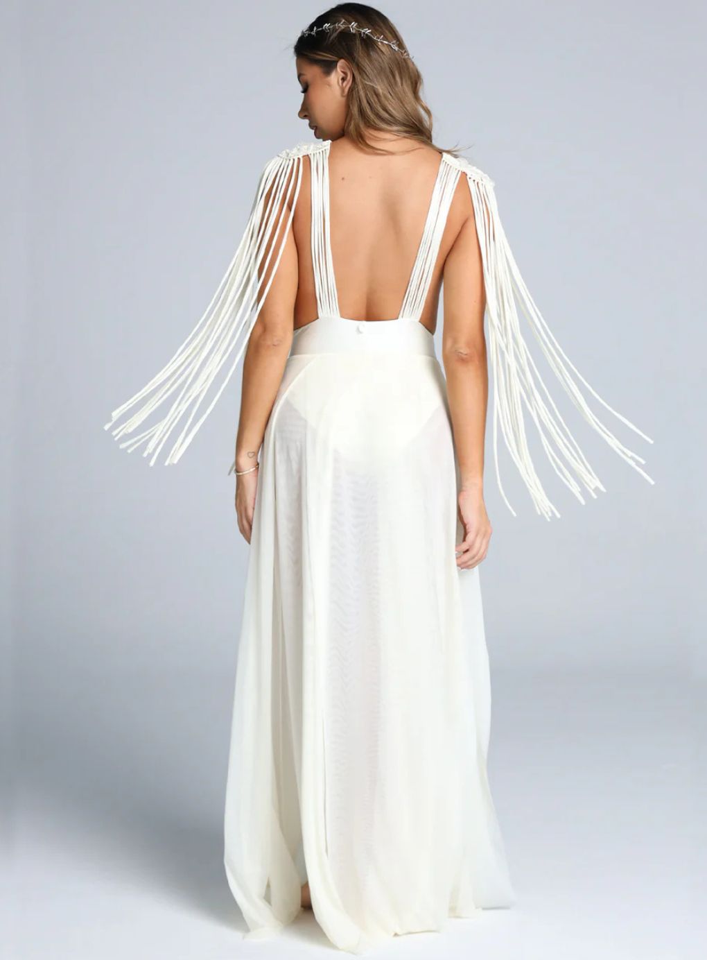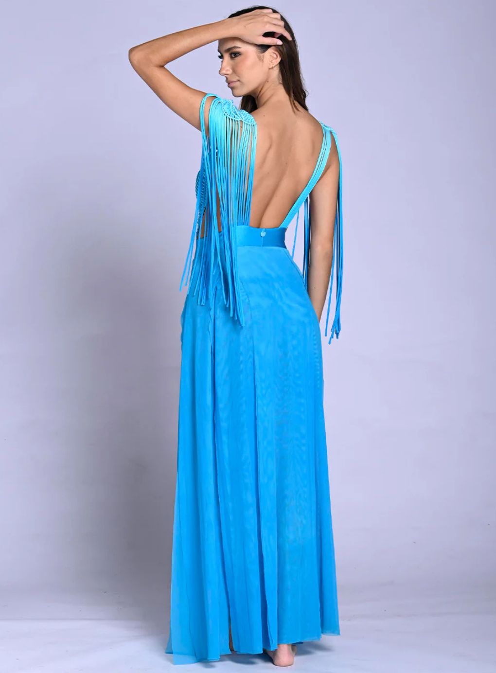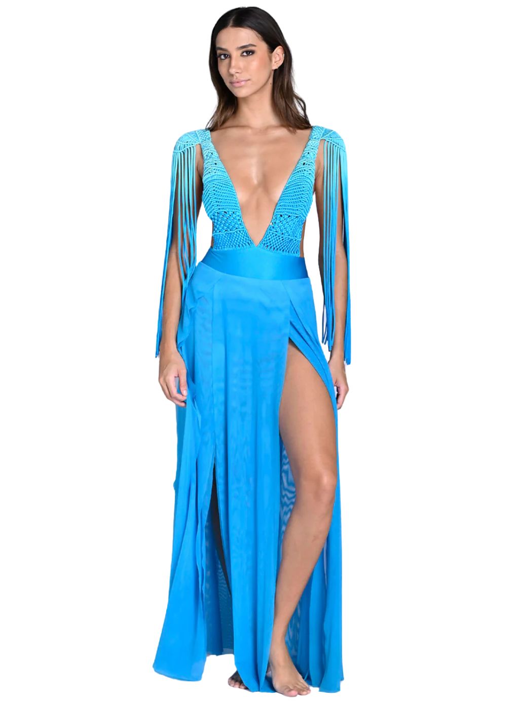 Turn heads with this show-stopping Dress—a one-of-a-kind gown designed to captivate. This stunning piece features a dramatic plunging neckline, a wide waistband, and a luxurious tulle skirt with multiple leg slits for added allure. The macramé woven bust and low-back design exude sophistication, while the shoulder pads and extended block fabric tulle skirt create a striking silhouette. The fringe detail on the shoulders adds a touch of drama, ensuring all eyes are on you at any event.