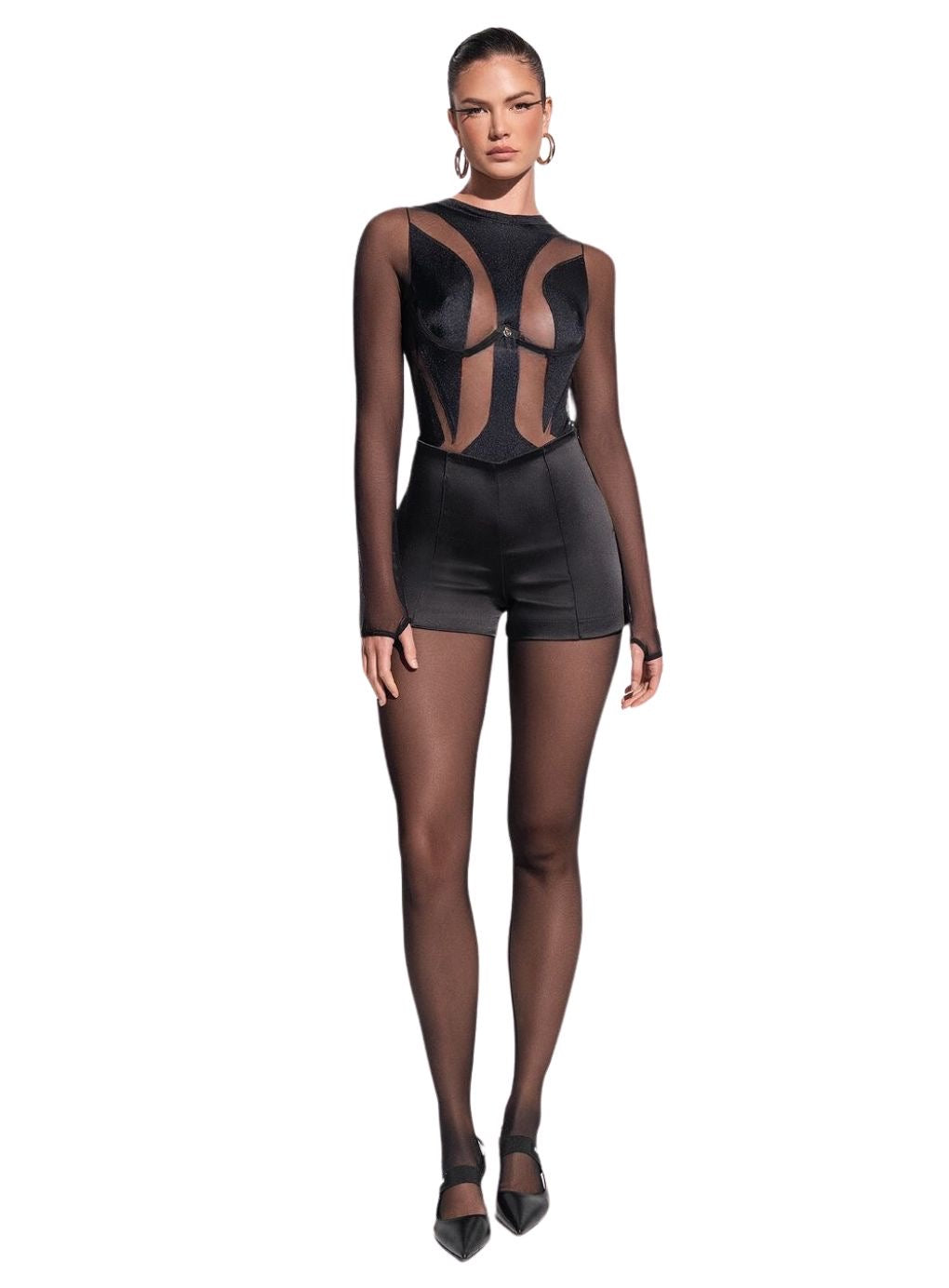 Elevate your style with the Expandida Cutout Tulle Bodysuit, a masterpiece of design and sophistication.