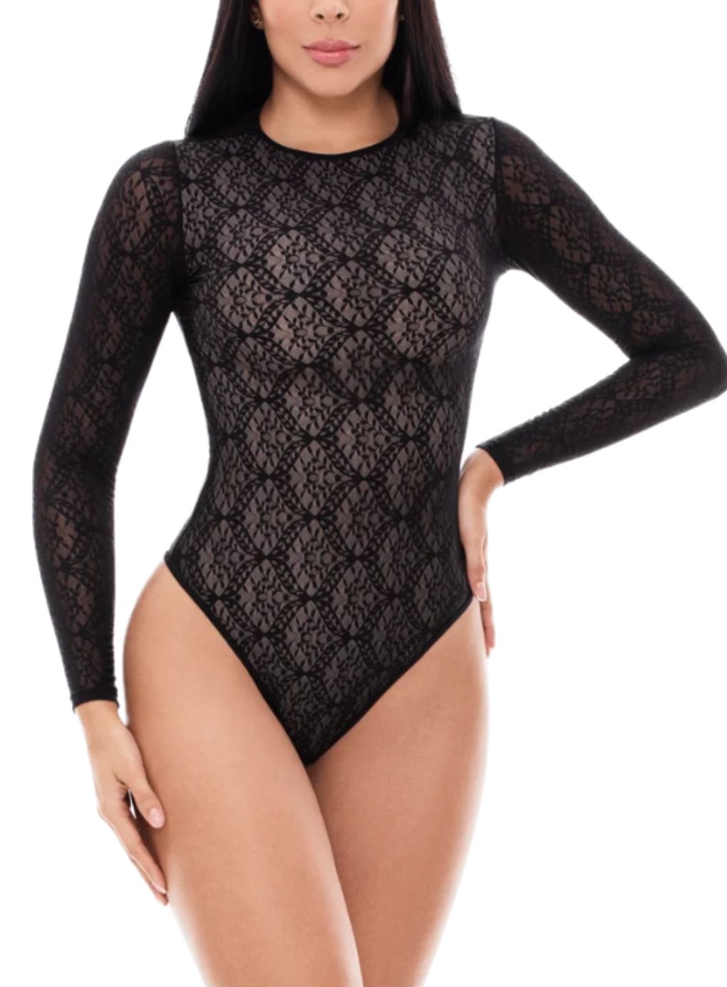 Featuring long sleeves provide a sleek and sophisticated look. Front transparency adds a touch of allure. Side cutouts with tulle fabric enhance the design, offering a modern edge. Thoughtfully designed front and back details. High cut for a lengthening and flattering effect.