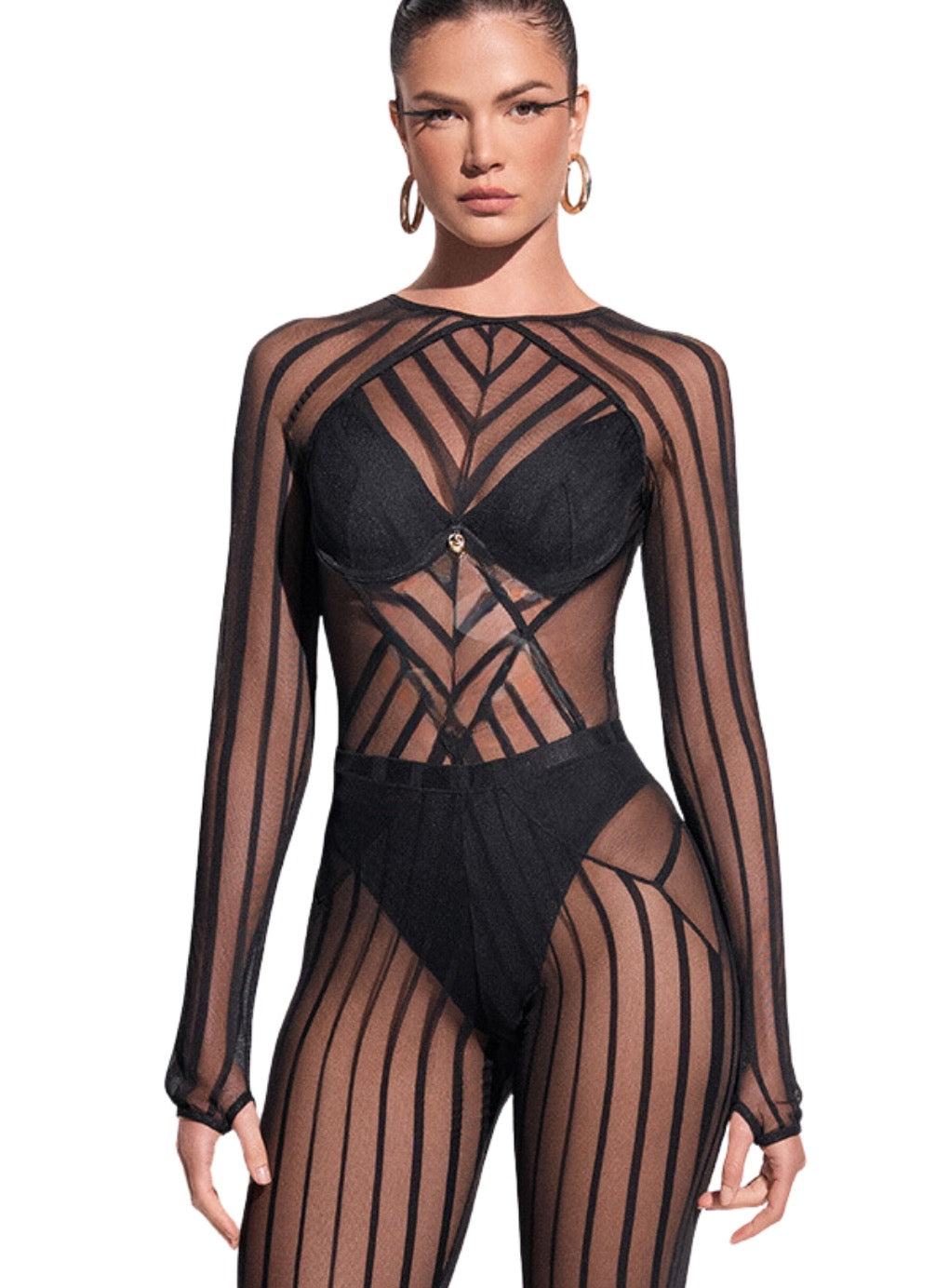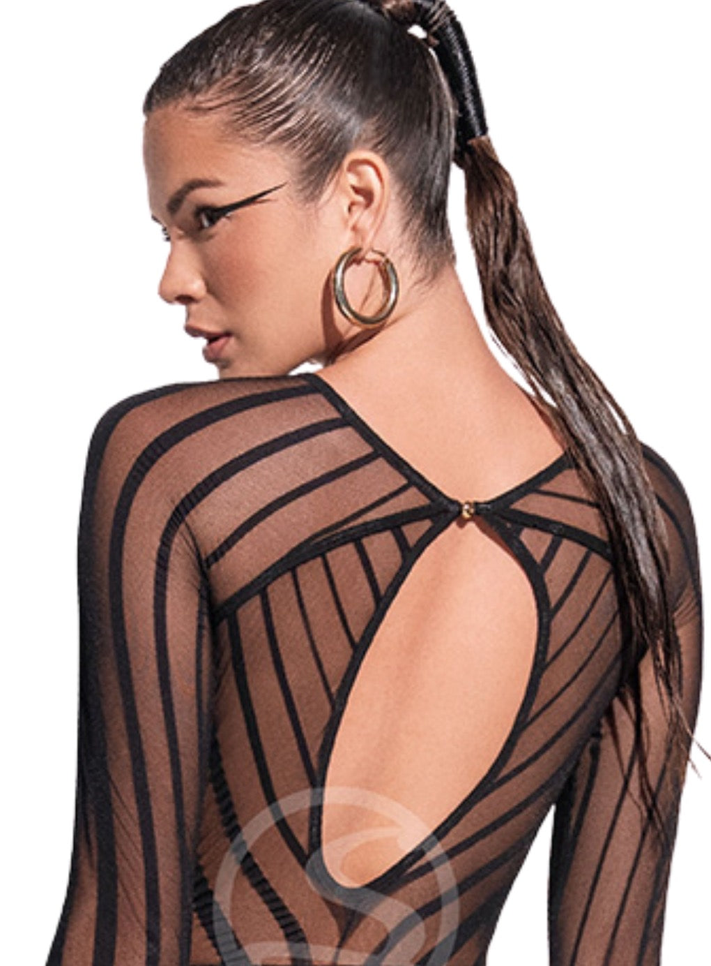 This bodysuit features intricate tulle detailing and bold cutouts that create a captivating visual appeal.