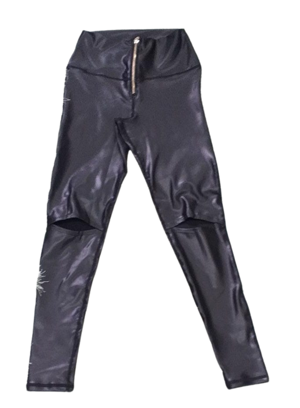 Introducing our Wet Look Leggings Ripped Knee, a stylish and edgy addition to your wardrobe. These leggings feature a wet look finish, giving them a sleek and shiny appearance. The ripped knee design adds a touch of rebelliousness and adds a trendy distressed look. Made from a comfortable and stretchy fabric, these leggings offer a flattering fit and allow for ease of movement. The wet look combined with the ripped knee detail creates a unique and fashionable look that can be dressed up or down. Whether you're pairing them with a casual top and sneakers for a day out or dressing them up with heels and a blouse for a night out, our Wet Look Leggings Ripped Knee are a versatile choice that will elevate your style. Embrace the bold and edgy vibe with these fashion-forward leggings. through.