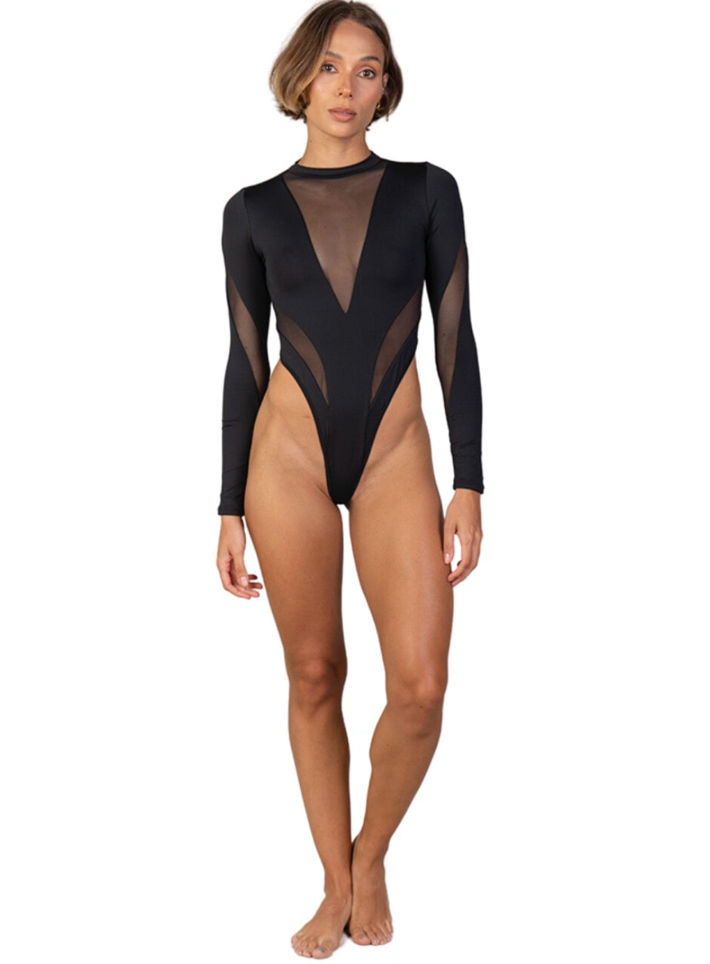 Turn heads with the striking Bodysuit Xenia. This halter neck bodysuit features a daring V-neckline, long sheer sleeves, and high-cut sides, creating a captivating and elegant look. The intricate design ensures you stand out at any event.